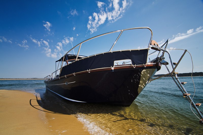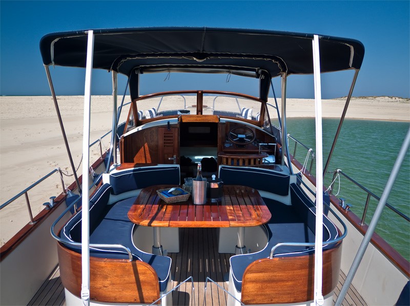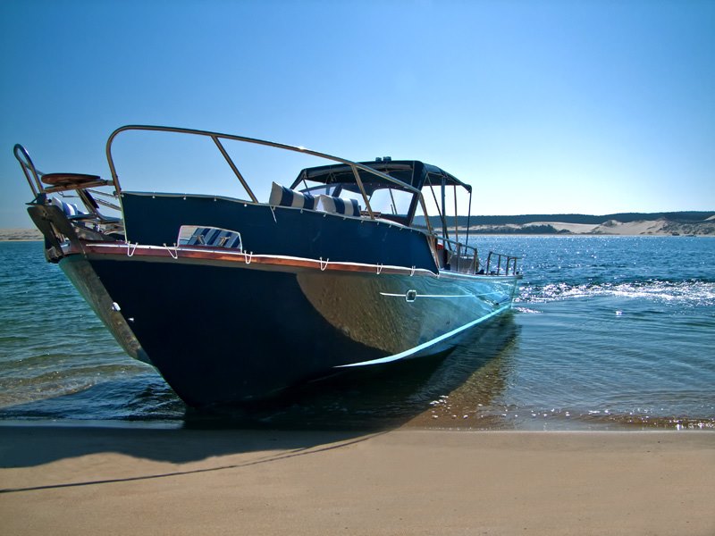 8,40 mètres de bois précieux, pont teck, mouchette d’érable cerclée de Sapelli; des formes héritées de l’époque des « beaux bateaux », posées sur la carène renommée du BEACHER 840. Le croisement de l’artisanat et de la technologie, pour un héritage de plaisir et de raison; en plus de son salon de pont arrière, le roof abrite une cuisine équipée en CORIAN massif, un compartiment WC, douche, une table de repas entourée de deux divans en Alcantara, un lit double avant en 140cm flanqué d’équipets et de tables de chevet, le tout, vernis à l’ancienne. Le tableau de bord futuriste inséré dans une niche de bois vernis, témoigne des performances du BEACHER D’ARCACHON équipé de 300CV.
