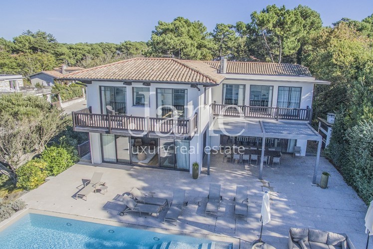 Its rare and exceptional setting places it as one of the most fascinating houses in the Arcachon basin. With a living area of ​​680m2 and a plot of 2600m2, this property has not finished surprising you. You will appreciate the noble materials that are available in all rooms and all its equipment of the latest technology. Like a treasure, the property hides many wonders, you will discover a breathtaking view of the basin and this from various angles. A real privilege that will leave his guests speechless. The property is composed of a mansion, a guest house and a caretaker’s house. The mansion then lets discover from the ground floor a beautiful living room with gas fireplace, a guest lounge, a media lounge and a beautiful kitchen perfectly equipped. Not to mention its refrigerated wine cellar that holds up to 300 bottles. Accessed by the lounge, an outdoor terrace promises intense trips where you can admire indefinitely the game of waves of the ocean. Unless you prefer to contemplate the view from the infinity pool. On the first floor, exceptional nights are waiting for you thanks to a parental suite and a VIP room which have a marvelous view on the ocean. Another double room completes the level. On one level with the garden, the lower level of the villa hosts a beautiful double bedroom with a bathroom and a dormitory of 3 single beds. As for the guest house, this one consists of 3 double bedrooms, a living room, a kitchen, a living room and a mezzanine with video room. Available for sale and rent, here is a property like you’ve never seen …